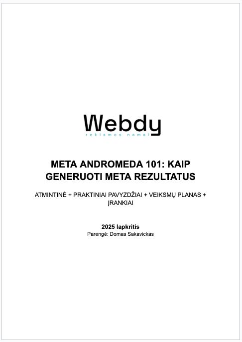 Viskas ką reikia žinoti apie Meta Andromeda atnaujinimą. 17 puslapių atmintinė su realiais pavyzdžiais, rekomendacijomis ir konkrečiu veiksmų planu. Taip pat Canva ištestuoti vizualų šablonai, kuriuos galėsite naudoti patys.